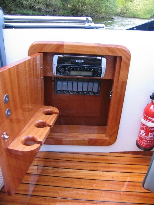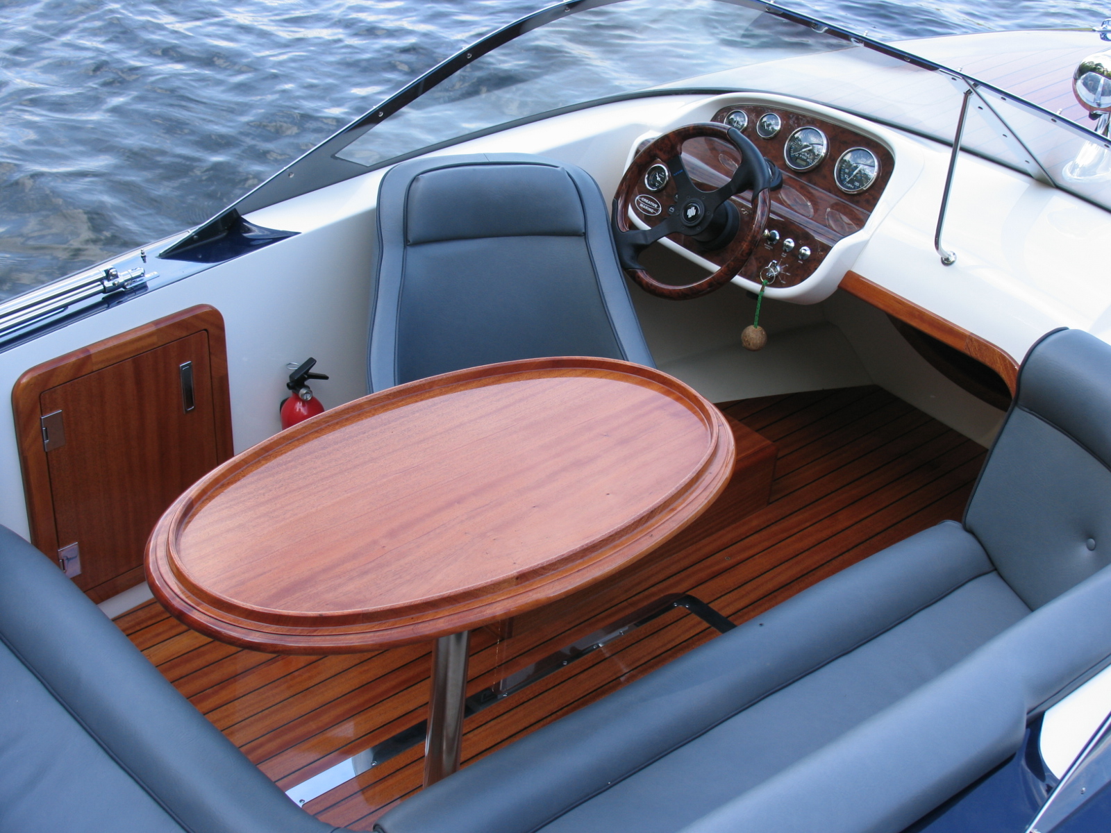 Her hull is moulded using high-quality Scott Bader resins for strength and longevity, and finished with Gelshield and antifouling below the waterline. Decks are finished in varnished mahogany, complemented by polished stainless steel and iroko detailing. A variety of hull and upholstery colours are available.