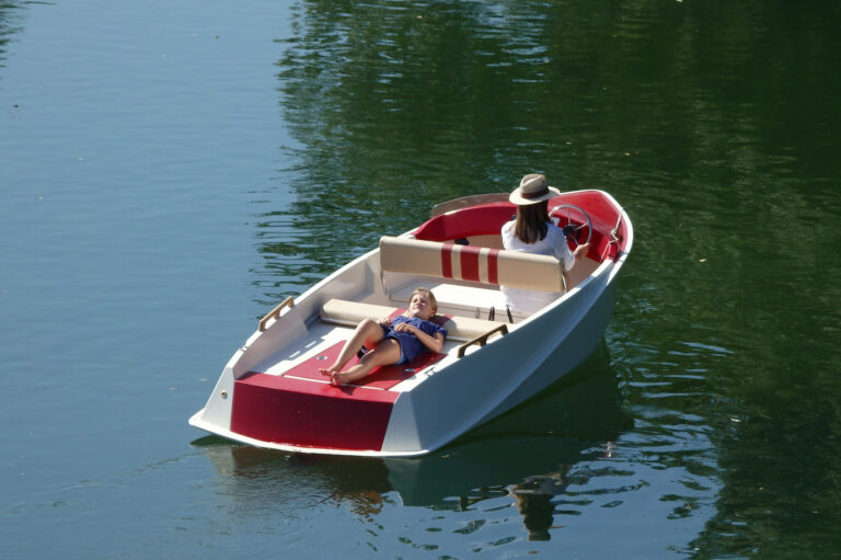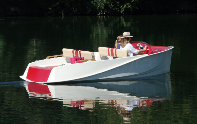 The neat little Derby 4.30 built in France by Saviboat is a smart electric alternative to the little day boats which you often find in hire fleets. In fact this model is so chic that it is also popular with private customers too. The boat seats five on two bench seats with room for sun bathing aft.