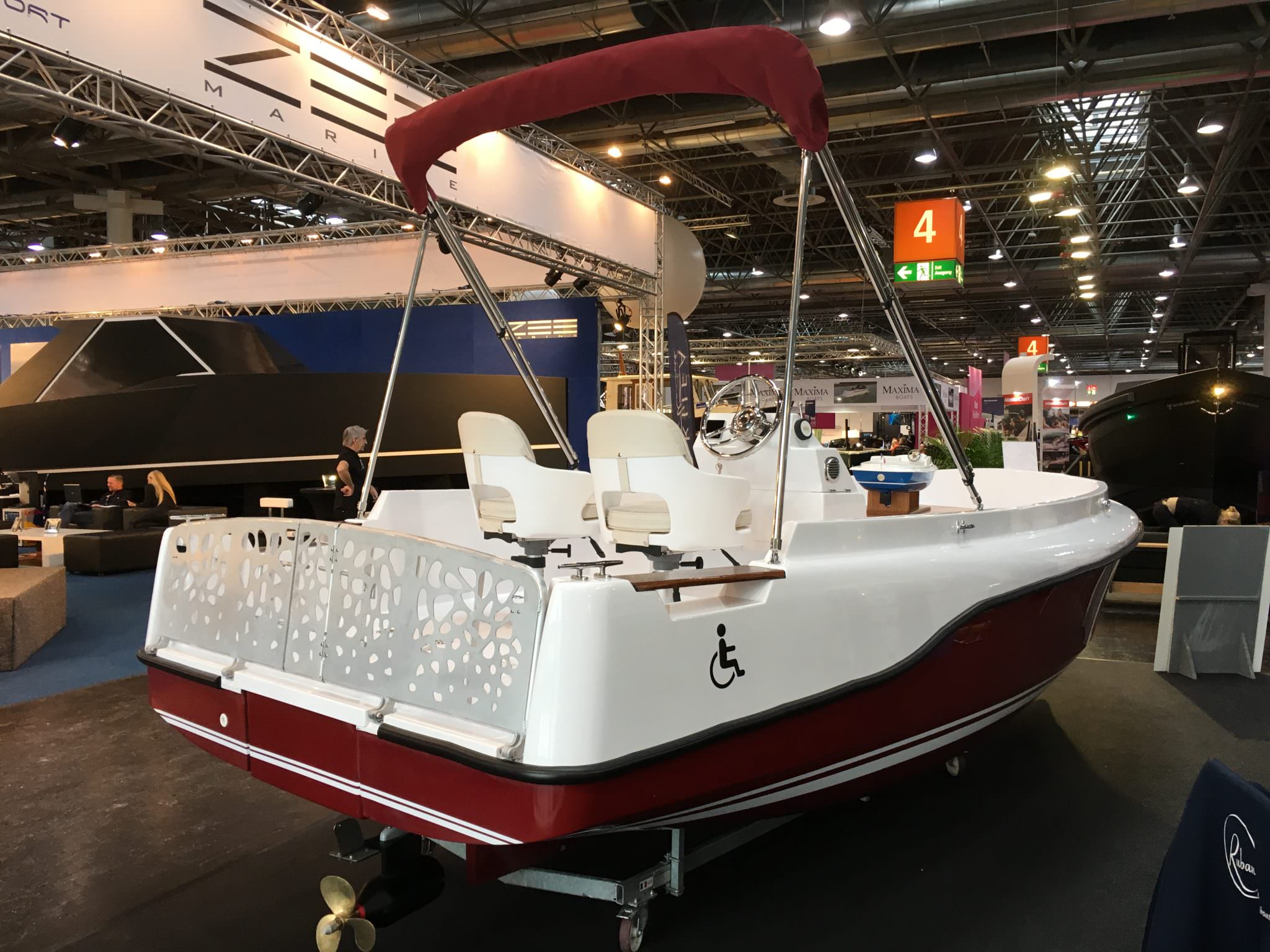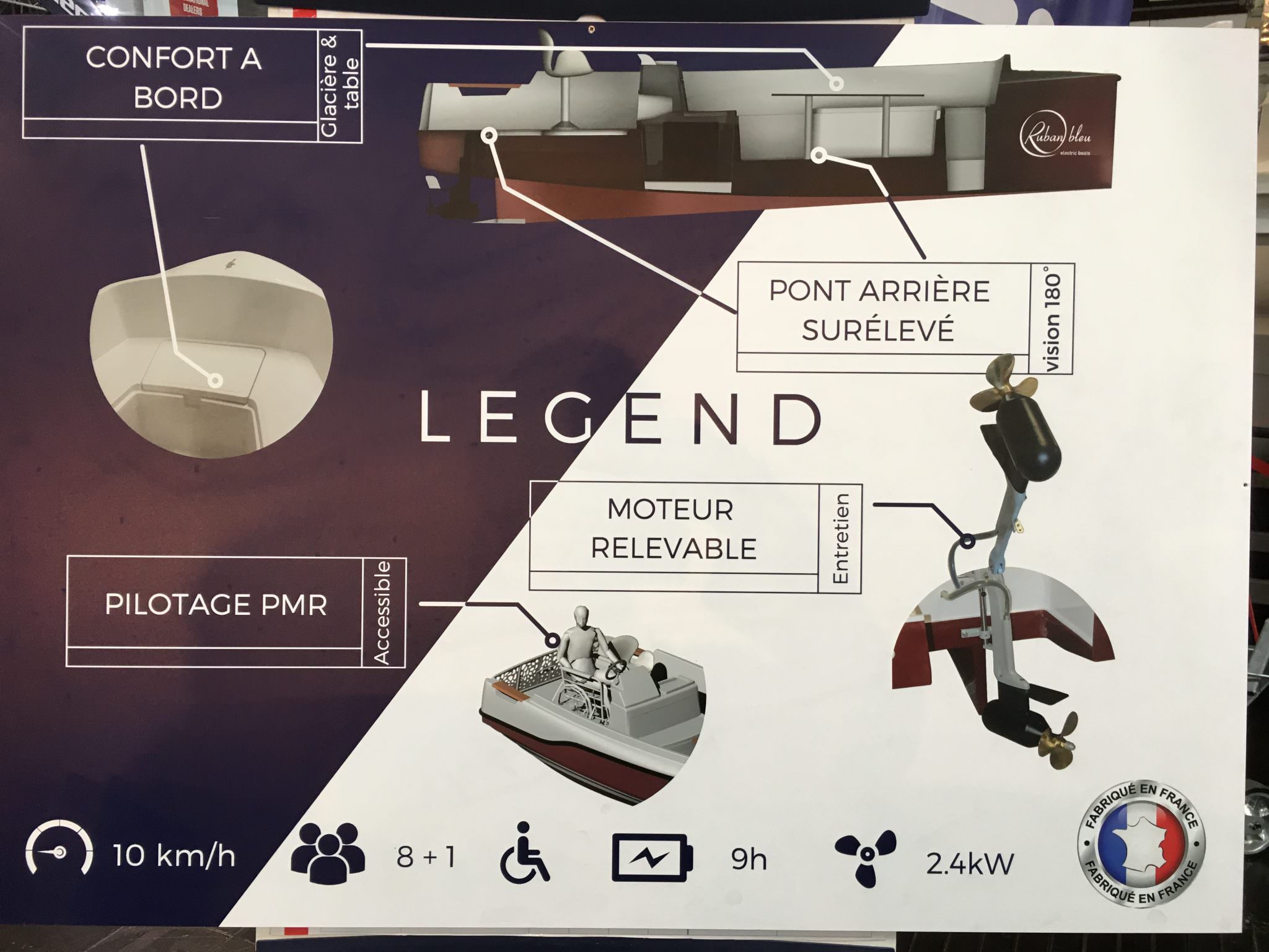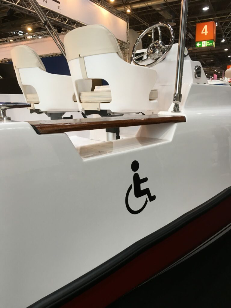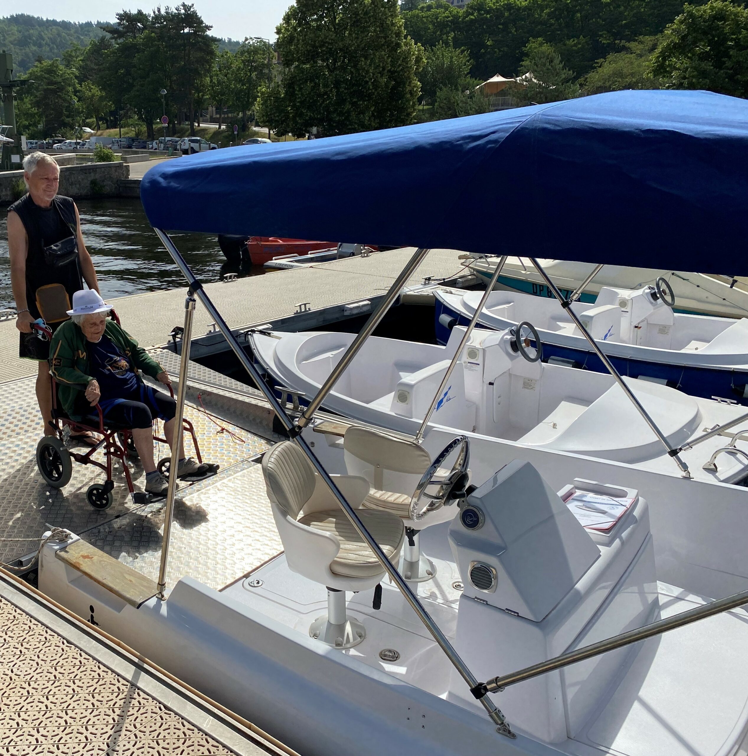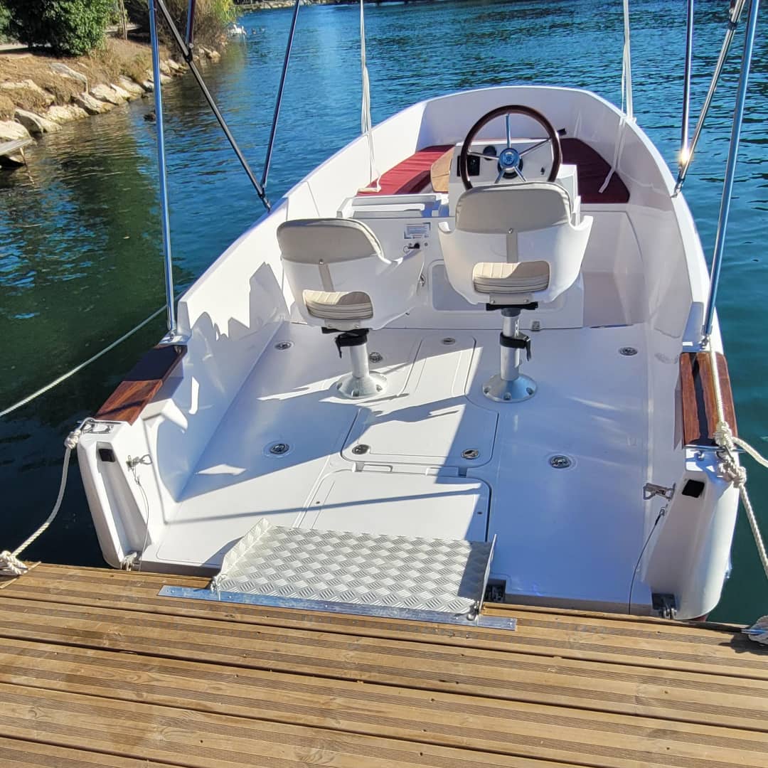 The movable seat of the pilot enables a person in a wheelchair to helm the boat. The backrest of the seat can also be turn 180 ° to enable better monitoring of the swimming area.